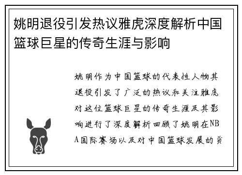 姚明,这位曾经在NBA赛场上叱诧风云的中国篮球巨星,不仅以出色的球技赢得了世界的赞誉,更以其背后的努力与坚持成为无数年轻运动员心中的榜样。本文将通过四个方面详细探讨姚明的训练秘诀,包括他的基础训练、心理素质、团队合作以及自我管理。这些因素共同构成了他成功的基石,揭示了这位“巨人”背后不为人知的艰辛与付出。通过分析这些训练秘诀,我们不仅可以更深入地理解姚明的职业生涯,也能激励更多人追求自己的梦想。 ...