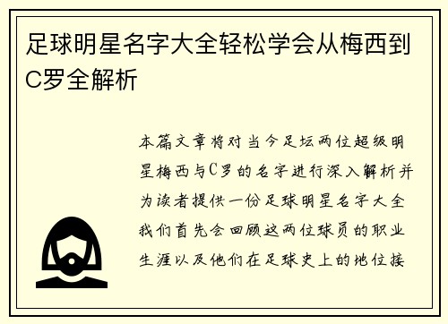 在现代社会,足球不仅是一项深受喜爱的运动,更是文化和商业的重要象征。因此,足球明星海报的创作显得尤为关键。本文将详细探讨如何创作一幅吸引眼球的足球明星海报,从选材、构图、色彩搭配与字体设计四个方面进行深入分析。首先,我们将讨论如何选择合适的素材,包括球员的照片和赛事背景;接着,将介绍构图技巧,使画面更加生动有趣;第三部分则专注于色彩搭配,强调视觉冲击力的重要性;最后,我们还会探讨字体设计对整体效果...